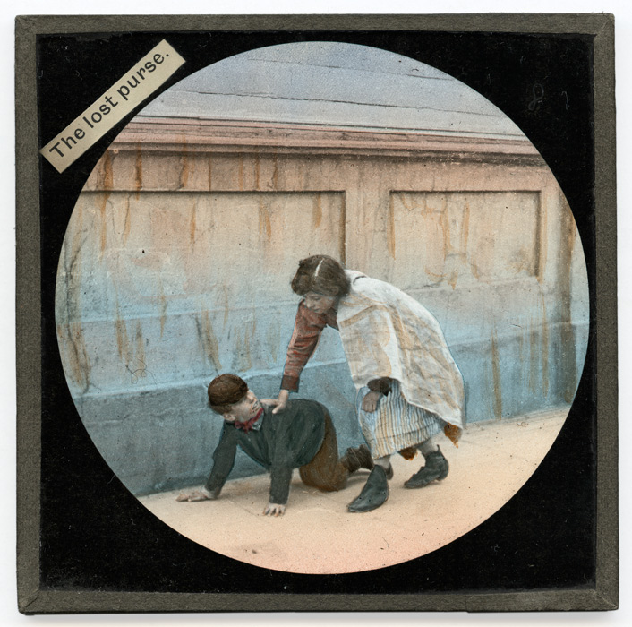 Meg et Jim Norris sont deux enfants vivant dans la misère (plaque 1). Ils avaient une belle maison auparavant, mais l'alcoolisme de leur père a causé leur chute dans la société. Pour survivre, les deux jeunes enfants vendent des allumettes dans la rue (plaque 2). Jim étant de faible constitution, Meg le laisse assis sur des marches, emmitouflé dans son châle, et vend seule leurs deux parts (plaque 3). Ayant réussi à tout vendre, elle part chercher de nouvelles allumettes et laisse le jeune garçon seul. A son retour, elle retrouve son frère avec un shilling en main (plaque 4).Très heureux, il lui explique la manière dont il a gagné cet argent. Il a vu une femme perdre son sac, alors qu'elle montait dans une voiture. Il a alors récupéré le sac et a tenté de rattraper la voiture en vain. Bill, un autre jeune garçon, a assisté à la scène et a proposé alors de rendre le sac à la dame et offre à Jim un shilling contre le sac. Trouvant l'idée honnête, Jim a ainsi accepté le shilling qu'il montre à présent à sa soeur (plaque 5). Mais à l'écoute de cette histoire, Meg est furieuse : le jeune Bill n'est pas quelqu'un d'honnête et il a manipulé son frère pour qu'il lui vende le sac. Le jeune garçon n'aurait jamais du céder le bien d'autrui ! Elle court rattraper Bill, laissant Jim à ses pleurs (plaque 6).