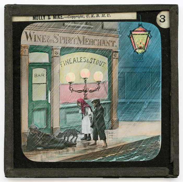 Très peu d'informations étant parvenues jusqu'à nous sur cette série, il est difficile de retracer avec précision l'histoire présentées sur ces dix-huit plaques de type Life Models. Néanmoins l'indication de l'U.K.B.H.U (United Kingdom Band of Hope Union) sur toutes les plaques confère de fait à cette série une certaine orientation thématique. L'association religieuse ayant à coeur la dénonciation des méfaits de l'alcoolisme et l'enseignement des bonnes moeurs, il est fort probable que "Molly and Mike" soit une histoire de ce type. Molly et Mike sont en effet deux jeunes enfants pauvres (plaque 1). Ils attendent sous la pluie devant un pub (plaque 2) que leur père veuille bien en sortir. Mais quand cela est fait, ils le retrouvent saoûl (plaque 3). Les deux enfants semblent désespérés par l'état de leur père (plaque 4) et c'est à ce moment qu'un homme, un gentleman, arrive vers eux (plaque 5). Il comprend vite la situation, empêche l'arrestation du père pour son ivresse sur la voie publique (plaque 6) et aide la petite famille à se mettre à l'abri (plaque 7). Si ce gentleman quitte Molly, Mike et leur père ce n'est que pour aller demander de l'aide pour eux auprès d'autres personnes (plaques 8 et 9).
