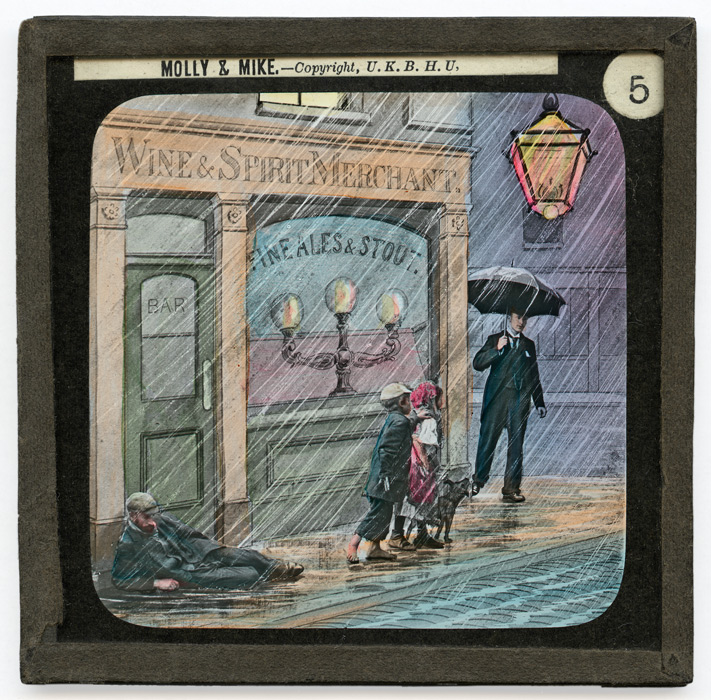 Très peu d'informations étant parvenues jusqu'à nous sur cette série, il est difficile de retracer avec précision l'histoire présentées sur ces dix-huit plaques de type Life Models. Néanmoins l'indication de l'U.K.B.H.U (United Kingdom Band of Hope Union) sur toutes les plaques confère de fait à cette série une certaine orientation thématique. L'association religieuse ayant à coeur la dénonciation des méfaits de l'alcoolisme et l'enseignement des bonnes moeurs, il est fort probable que "Molly and Mike" soit une histoire de ce type. Molly et Mike sont en effet deux jeunes enfants pauvres (plaque 1). Ils attendent sous la pluie devant un pub (plaque 2) que leur père veuille bien en sortir. Mais quand cela est fait, ils le retrouvent saoûl (plaque 3). Les deux enfants semblent désespérés par l'état de leur père (plaque 4) et c'est à ce moment qu'un homme, un gentleman, arrive vers eux (plaque 5). Il comprend vite la situation, empêche l'arrestation du père pour son ivresse sur la voie publique (plaque 6) et aide la petite famille à se mettre à l'abri (plaque 7). Si ce gentleman quitte Molly, Mike et leur père ce n'est que pour aller demander de l'aide pour eux auprès d'autres personnes (plaques 8 et 9).