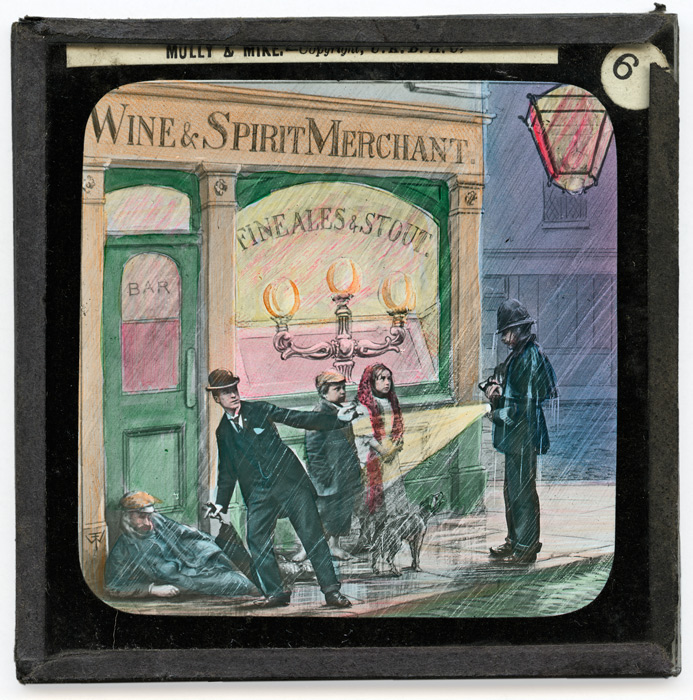 Très peu d'informations étant parvenues jusqu'à nous sur cette série, il est difficile de retracer avec précision l'histoire présentées sur ces dix-huit plaques de type Life Models. Néanmoins l'indication de l'U.K.B.H.U (United Kingdom Band of Hope Union) sur toutes les plaques confère de fait à cette série une certaine orientation thématique. L'association religieuse ayant à coeur la dénonciation des méfaits de l'alcoolisme et l'enseignement des bonnes moeurs, il est fort probable que "Molly and Mike" soit une histoire de ce type. Molly et Mike sont en effet deux jeunes enfants pauvres (plaque 1). Ils attendent sous la pluie devant un pub (plaque 2) que leur père veuille bien en sortir. Mais quand cela est fait, ils le retrouvent saoûl (plaque 3). Les deux enfants semblent désespérés par l'état de leur père (plaque 4) et c'est à ce moment qu'un homme, un gentleman, arrive vers eux (plaque 5). Il comprend vite la situation, empêche l'arrestation du père pour son ivresse sur la voie publique (plaque 6) et aide la petite famille à se mettre à l'abri (plaque 7). Si ce gentleman quitte Molly, Mike et leur père ce n'est que pour aller demander de l'aide pour eux auprès d'autres personnes (plaques 8 et 9).