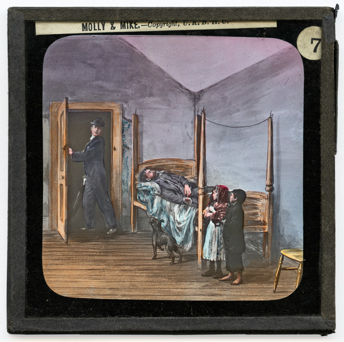 Très peu d'informations étant parvenues jusqu'à nous sur cette série, il est difficile de retracer avec précision l'histoire présentées sur ces dix-huit plaques de type Life Models. Néanmoins l'indication de l'U.K.B.H.U (United Kingdom Band of Hope Union) sur toutes les plaques confère de fait à cette série une certaine orientation thématique. L'association religieuse ayant à coeur la dénonciation des méfaits de l'alcoolisme et l'enseignement des bonnes moeurs, il est fort probable que "Molly and Mike" soit une histoire de ce type. Molly et Mike sont en effet deux jeunes enfants pauvres (plaque 1). Ils attendent sous la pluie devant un pub (plaque 2) que leur père veuille bien en sortir. Mais quand cela est fait, ils le retrouvent saoûl (plaque 3). Les deux enfants semblent désespérés par l'état de leur père (plaque 4) et c'est à ce moment qu'un homme, un gentleman, arrive vers eux (plaque 5). Il comprend vite la situation, empêche l'arrestation du père pour son ivresse sur la voie publique (plaque 6) et aide la petite famille à se mettre à l'abri (plaque 7). Si ce gentleman quitte Molly, Mike et leur père ce n'est que pour aller demander de l'aide pour eux auprès d'autres personnes (plaques 8 et 9).