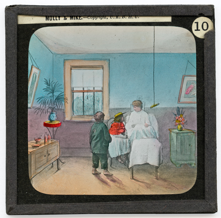 Très peu d'informations étant parvenues jusqu'à nous sur cette série, il est difficile de retracer avec précision l'histoire présentées sur ces dix-huit plaques de type Life Models. Néanmoins l'indication de l'U.K.B.H.U (United Kingdom Band of Hope Union) sur toutes les plaques confère de fait à cette série une certaine orientation thématique. L'association religieuse ayant à coeur la dénonciation des méfaits de l'alcoolisme et l'enseignement des bonnes moeurs, il est fort probable que "Molly and Mike" soit une histoire de ce type. Molly et Mike sont en effet deux jeunes enfants pauvres (plaque 1). Ils attendent sous la pluie devant un pub (plaque 2) que leur père veuille bien en sortir. Mais quand cela est fait, ils le retrouvent saoûl (plaque 3). Les deux enfants semblent désespérés par l'état de leur père (plaque 4) et c'est à ce moment qu'un homme, un gentleman, arrive vers eux (plaque 5). Il comprend vite la situation, empêche l'arrestation du père pour son ivresse sur la voie publique (plaque 6) et aide la petite famille à se mettre à l'abri (plaque 7). Si ce gentleman quitte Molly, Mike et leur père ce n'est que pour aller demander de l'aide pour eux auprès d'autres personnes (plaques 8 et 9).