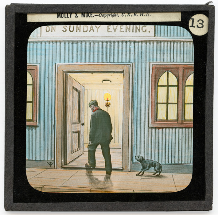 Très peu d'informations étant parvenues jusqu'à nous sur cette série, il est difficile de retracer avec précision l'histoire présentées sur ces dix-huit plaques de type Life Models. Néanmoins l'indication de l'U.K.B.H.U (United Kingdom Band of Hope Union) sur toutes les plaques confère de fait à cette série une certaine orientation thématique. L'association religieuse ayant à coeur la dénonciation des méfaits de l'alcoolisme et l'enseignement des bonnes moeurs, il est fort probable que "Molly and Mike" soit une histoire de ce type. Molly et Mike sont en effet deux jeunes enfants pauvres (plaque 1). Ils attendent sous la pluie devant un pub (plaque 2) que leur père veuille bien en sortir. Mais quand cela est fait, ils le retrouvent saoûl (plaque 3). Les deux enfants semblent désespérés par l'état de leur père (plaque 4) et c'est à ce moment qu'un homme, un gentleman, arrive vers eux (plaque 5). Il comprend vite la situation, empêche l'arrestation du père pour son ivresse sur la voie publique (plaque 6) et aide la petite famille à se mettre à l'abri (plaque 7). Si ce gentleman quitte Molly, Mike et leur père ce n'est que pour aller demander de l'aide pour eux auprès d'autres personnes (plaques 8 et 9).