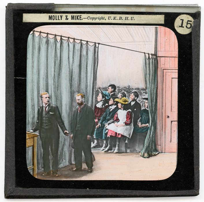 Très peu d'informations étant parvenues jusqu'à nous sur cette série, il est difficile de retracer avec précision l'histoire présentées sur ces dix-huit plaques de type Life Models. Néanmoins l'indication de l'U.K.B.H.U (United Kingdom Band of Hope Union) sur toutes les plaques confère de fait à cette série une certaine orientation thématique. L'association religieuse ayant à coeur la dénonciation des méfaits de l'alcoolisme et l'enseignement des bonnes moeurs, il est fort probable que "Molly and Mike" soit une histoire de ce type. Molly et Mike sont en effet deux jeunes enfants pauvres (plaque 1). Ils attendent sous la pluie devant un pub (plaque 2) que leur père veuille bien en sortir. Mais quand cela est fait, ils le retrouvent saoûl (plaque 3). Les deux enfants semblent désespérés par l'état de leur père (plaque 4) et c'est à ce moment qu'un homme, un gentleman, arrive vers eux (plaque 5). Il comprend vite la situation, empêche l'arrestation du père pour son ivresse sur la voie publique (plaque 6) et aide la petite famille à se mettre à l'abri (plaque 7). Si ce gentleman quitte Molly, Mike et leur père ce n'est que pour aller demander de l'aide pour eux auprès d'autres personnes (plaques 8 et 9).