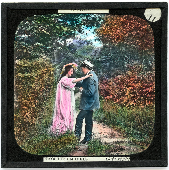 Doreen. Les trois premières plaques de la série nous font découvrir la rencontre entre les deux jeunes gens : à la lumière des derniers rayons de soleil, un jeune homme aperçoit une jeune fille se promenant non loin de lui. Il tombe de suite sous le charme de cette vision (plaque 5). En sa compagnie, il ne voit que sa beauté et c'est tout son coeur qui se remplit alors de bonheur (plaques 6, 7, 8, 9, 10 et 11).