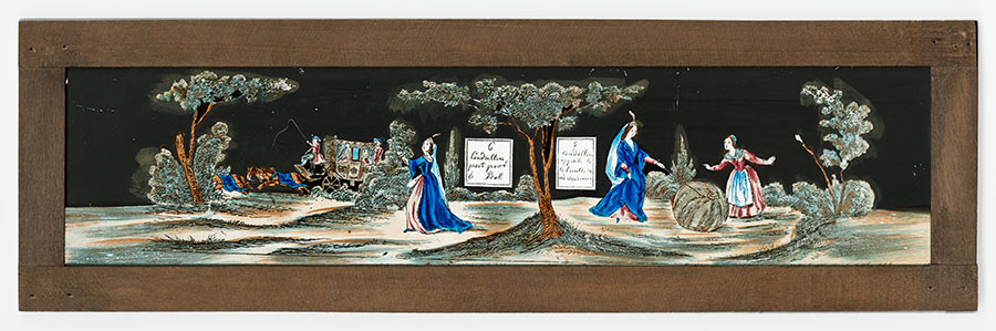 Les six plaques de verre reprennent tour à tour les étapes narratives du conte : l'histoire commence aux vues 1 et 2 (plaque 1) : Cendrillon est seule dans une cuisine et vit dans un grenier. Puis vient l'annonce du bal, elle aide ses belles-soeurs à s'y préparer (vue 3, plaque 2) avant que celles-ci partent en la laissant seule (vue 4, plaque 2). A ce moment là arrive la bonne fée marraine (vue 5, plaque 3) et Cendrillon peut enfin partir au bal (vue 6, plaque 3). Au bal, elle rencontre le prince (plaque 4), mais la magie de la bonne fée marraine étant de courte durée, Cendrillon doit partir et perd sa pantoufle de verre (plaque 5). Grâce à cette pantoufle, le prince retrouve Cendrillon (plaque 6).