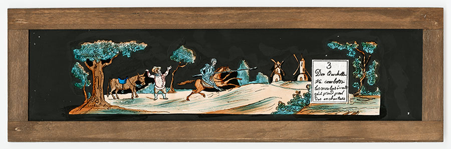 Illustration des péripéties les plus connues des aventures de Don Quichotte, de sa décision de devenir un chevalier (plaque 1), son adoubement de chevalier (plaque 2) jusqu'à son retour (plaque 6) après avoir lutté contre des moulins à vent (plaque 3), combattu des outres pleines de vin (plaque 4) ou encore vaincu des marionnettes (plaque 5).