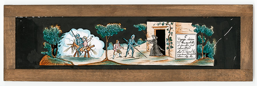 Illustration des péripéties les plus connues des aventures de Don Quichotte, de sa décision de devenir un chevalier (plaque 1), son adoubement de chevalier (plaque 2) jusqu'à son retour (plaque 6) après avoir lutté contre des moulins à vent (plaque 3), combattu des outres pleines de vin (plaque 4) ou encore vaincu des marionnettes (plaque 5).