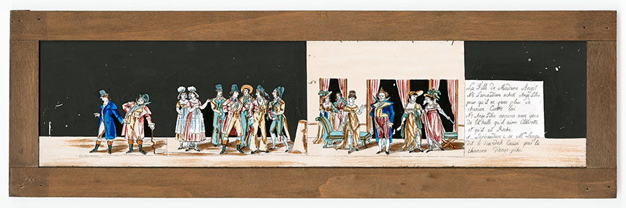 Clairette, fille de Madame Angot, est élevée par les Dames de la Halle. Elle doit se marier avec Pomponnet, perruquier, qui est très amoureux d'elle (plaque 1). Mais Clairette aime Ange-Pitou, un chansonnier, et cherche par tous les moyens à empêcher le mariage. Elle décide alors de chanter sur la place publique une chanson défendue et est envoyée en prison (plaque 2). La chanson était dirigée contre Mademoiselle Lange, une actrice, amie du banquier Larivaudière. Ange-Pitou, malheureux de voir Clairette en prison, fait croire que la chanson est de lui. Larivaudière, le croyant l'auteur de la chanson, achète son silence pour l'honneur de Mademoiselle Lange. Ange-Pitou maintenant riche, annonce à tous qu'il aime Clairette et peut l'épouser. Larivaudière rend ensuite visite à Mademoiselle Lange et lui raconte toute l'histoire (plaque 3). Mademoiselle Lange veut alors rencontrer Ange-Pitou, auteur de la chanson contre elle. Très rapidement, ils tombent sous le charme l'un de l'autre (plaque 4). Mademoiselle aidait en secret Ange-Pitou en conspirant également contre la République.