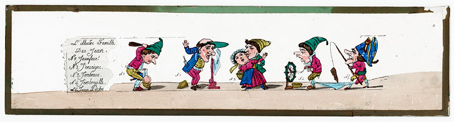 Les vingt-quatre vues présentées sur les six plaques font se succéder des petites scènes drôles de la vie quotidienne en déclinant le phonème "jean". De Jeanfesse (plaque 1) à J'embâille (plaque 6) toutes les situations les plus saugrenues sont ici imagées pour le plus grand plaisir du spectateur.