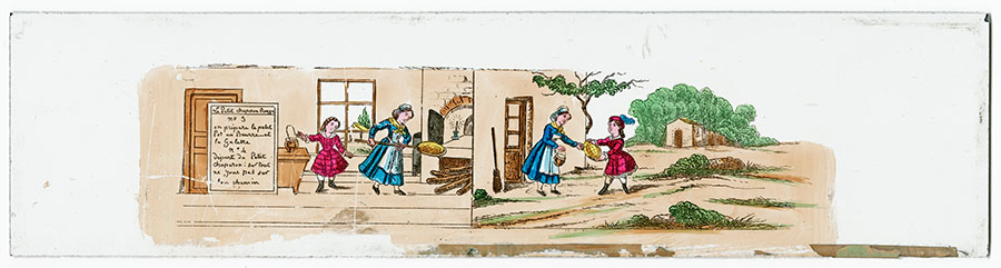 Mère-grand attend avec impatience la venue de sa chère petite-fille, le Petit Chaperon Rouge, mais le loup rôde dans les environs (plaque 1). La mère du Petit Chaperon Rouge prépare le panier de provisions à porter à Mère-grand et recommande à l'enfant d'y aller directement sans jouer sur son chemin (plaque 2). La fillette rencontre le loup et commet l'imprudence de lui indiquer l'endroit où réside sa mère-grand (plaque 3). Oubliant les conseils de sa mère, elle joue en chemin (plaque 4). Pendant ce temps-là, le loup trompe la mère-grand pour entrer chez elle et la croque (plaque 5). Le Petit Chaperon Rouge arrive enfin et est aussi trompé par le loup habillé en mère-grand et finit aussi mangé par le loup (plaque 6).