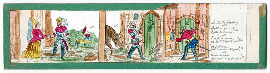 Cette chanson humoristique se moque d'un sire qui se marie à une jeune femme (plaque 1), la quitte trop longtemps pour partir à la guerre (plaque 2) et ne retrouve personne dans son château à son retour. Finalement il trouve sa femme dans un bal, s'amusant avec d'autres (plaque 3). Fou de rage, il la ramène de force dans son château (plaque 4) et décide de la tuer (plaque 5). La dernière plaque donne la morale de cette chanson "A jeune femme, il faut jeune mari!".