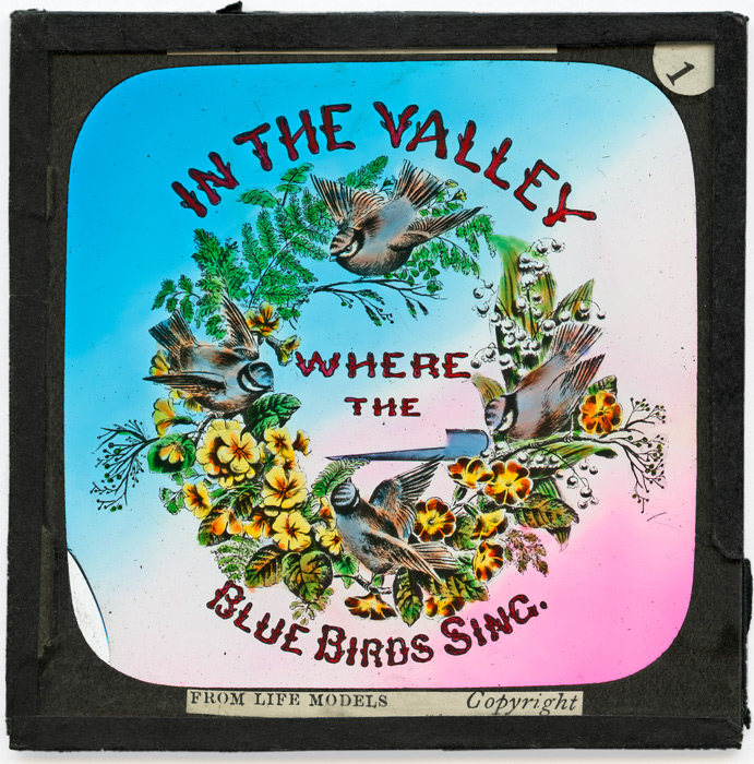 Pensées d'un jeune homme pour sa tendre aimée en treize vues, cette série est fidèle à la chanson populaire composée par Alfred Soleman et Monroe Rosenfeld en 1902. Se reposant dans une vallée verdoyante, un jeune homme laisse courir ses pensées vers sa bien aimée (plaques 2 et 3). Il revoit la jeune fille dans différentes situations : attendant à sa fenêtre (plaque 4), les moments passés ensemble (plaque 5) ou encore elle seule chantant au milieu de la vallée accompagnant les merles bleus (plaque 6). L'amour est bel et bien au centre de cette histoire et la plaque numéro 7 le célèbre avec son cache en forme de coeur. Jusqu'à la dernière plaque, le jeune homme ne cesse de penser à sa bien aimée (plaques 8, 9, 10, 11, 12 et 13).
