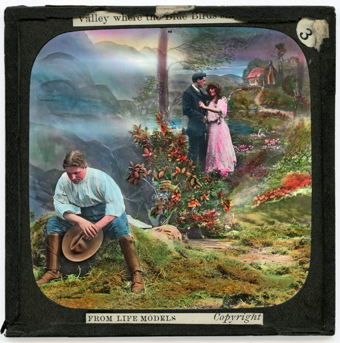 Pensées d'un jeune homme pour sa tendre aimée en treize vues, cette série est fidèle à la chanson populaire composée par Alfred Soleman et Monroe Rosenfeld en 1902. Se reposant dans une vallée verdoyante, un jeune homme laisse courir ses pensées vers sa bien aimée (plaques 2 et 3). Il revoit la jeune fille dans différentes situations : attendant à sa fenêtre (plaque 4), les moments passés ensemble (plaque 5) ou encore elle seule chantant au milieu de la vallée accompagnant les merles bleus (plaque 6). L'amour est bel et bien au centre de cette histoire et la plaque numéro 7 le célèbre avec son cache en forme de coeur. Jusqu'à la dernière plaque, le jeune homme ne cesse de penser à sa bien aimée (plaques 8, 9, 10, 11, 12 et 13).