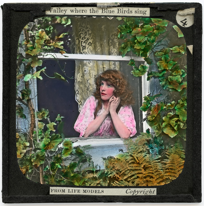 Pensées d'un jeune homme pour sa tendre aimée en treize vues, cette série est fidèle à la chanson populaire composée par Alfred Soleman et Monroe Rosenfeld en 1902. Se reposant dans une vallée verdoyante, un jeune homme laisse courir ses pensées vers sa bien aimée (plaques 2 et 3). Il revoit la jeune fille dans différentes situations : attendant à sa fenêtre (plaque 4), les moments passés ensemble (plaque 5) ou encore elle seule chantant au milieu de la vallée accompagnant les merles bleus (plaque 6). L'amour est bel et bien au centre de cette histoire et la plaque numéro 7 le célèbre avec son cache en forme de coeur. Jusqu'à la dernière plaque, le jeune homme ne cesse de penser à sa bien aimée (plaques 8, 9, 10, 11, 12 et 13).