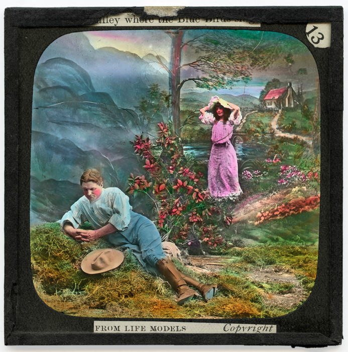 Pensées d'un jeune homme pour sa tendre aimée en treize vues, cette série est fidèle à la chanson populaire composée par Alfred Soleman et Monroe Rosenfeld en 1902. Se reposant dans une vallée verdoyante, un jeune homme laisse courir ses pensées vers sa bien aimée (plaques 2 et 3). Il revoit la jeune fille dans différentes situations : attendant à sa fenêtre (plaque 4), les moments passés ensemble (plaque 5) ou encore elle seule chantant au milieu de la vallée accompagnant les merles bleus (plaque 6). L'amour est bel et bien au centre de cette histoire et la plaque numéro 7 le célèbre avec son cache en forme de coeur. Jusqu'à la dernière plaque, le jeune homme ne cesse de penser à sa bien aimée (plaques 8, 9, 10, 11, 12 et 13).