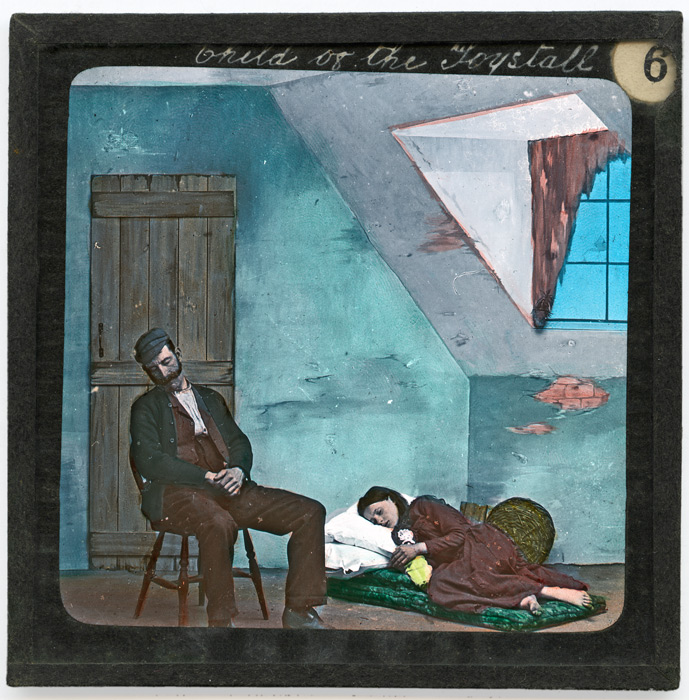 L'histoire se concentre autour d'une fillette, Maggie, héroïne malheureuse évoquant Oliver Twist ou le Rémi de Sans Famille. Maggie est une petite fille pauvre, qui ne peut qu'admirer les jouets du marchand Tom Fowler (plaque 1). La première bienfaitrice de Maggie apparaît à la plaque 2, accompagnée de son enfant. Alors qu'elle offre un jouet à sa petite fille, elle voit la tristesse de la pauvre Maggie et décide de lui offrir le jouet qu'elle souhaite. Maggie, comblée de joie, choisit une poupée (plaques 2, 3 et 4). De retour chez elle, Maggie admire son trésor. Cette poupée est le seul bien qu'elle possède. Mais qu'importe, la petite Maggie est heureuse avec sa poupée et elle s'endort doucement (plaque 5). Apparaît alors le père de Maggie (plaque 6). A son réveil, il voit le trésor de sa fille, il trouve la poupée si jolie qu'il décide de la faire admirer à ses amis, au pub (plaques 7 et 8). Les plaques 9 à 12 mettent en lumière les méfaits de l'alcoolisme : la fille de la tenancière du pub veut cette jolie poupée, le père de Maggie décide alors d'échanger le trésor de sa fille contre quelques verres de Gin. Pendant ce temps, Maggie se réveille toute seule et découvre avec stupeur que sa poupée a disparu, envahie de tristesse, elle retourne chez le marchand de jouets (plaques 13 et 14). Emu par la petite fille, il décide de faire partager son métier avec Maggie afin qu'elle se console (plaque 15). Mais un nouveau drame survint, Maggie apprend que son père est à l'hôpital, mourant. Elle se précipite à son chevet (plaque 16). Le pauvre homme, plein de remords sur son lit de mort, confie à sa fille qu'il lui a volé sa poupée. Maggie pardonne avant que son père ne meurt (plaques 17 et 18). Désormais orpheline, elle retourne chez Tom Fowler qui décide de prendre complètement en charge l'enfant (plaque 19). L'homme est âgé et la maladie le guette aussi, Maggie continue seule la vente des jouets pour aider son ami (plaque 20). Un médecin, le Dr. Hall, ami du marchand de jouet, attendri par la fillette lui offre un thé et des gâteaux (plaques 21 à 23) et aussi de quoi acheter du charbon, se rendant compte qu'il n'y a pas de feu dans la cheminée de la chambre du malade (plaque 24). La brave Maggie reste au chevet de son bienfaiteur et lui lit la Bible (plaques 25 et 26), alors que la fille du Dr. Hall leur rend visite et apporte des vivres (plaque 27). Le livret accompagnant la projection nous apprend que la fillette est recueillie par le médecin, et entre à son service où elle reçoit un bon salaire. En mémoire de son vieil ami, Tom Fowler, qui a tant fait pour elle, chaque été elle fleurit sa tombe (plaque 28).