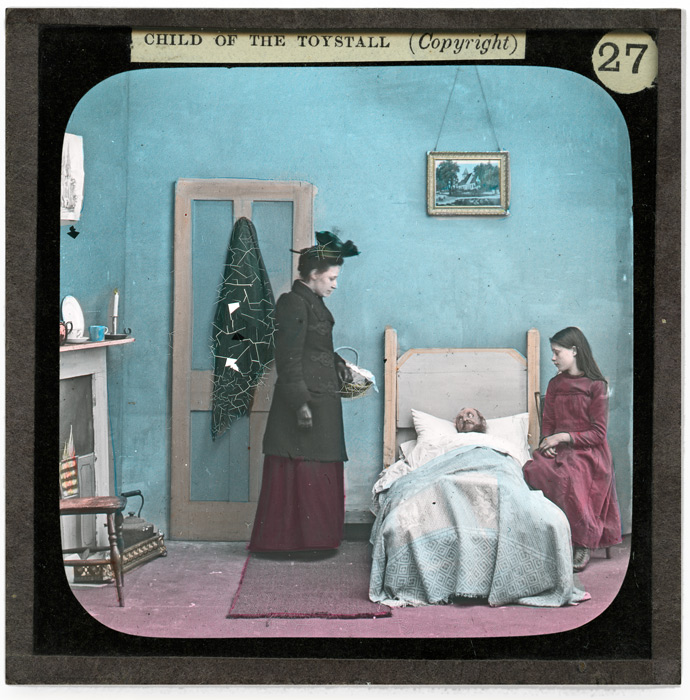 L'histoire se concentre autour d'une fillette, Maggie, héroïne malheureuse évoquant Oliver Twist ou le Rémi de Sans Famille. Maggie est une petite fille pauvre, qui ne peut qu'admirer les jouets du marchand Tom Fowler (plaque 1). La première bienfaitrice de Maggie apparaît à la plaque 2, accompagnée de son enfant. Alors qu'elle offre un jouet à sa petite fille, elle voit la tristesse de la pauvre Maggie et décide de lui offrir le jouet qu'elle souhaite. Maggie, comblée de joie, choisit une poupée (plaques 2, 3 et 4). De retour chez elle, Maggie admire son trésor. Cette poupée est le seul bien qu'elle possède. Mais qu'importe, la petite Maggie est heureuse avec sa poupée et elle s'endort doucement (plaque 5). Apparaît alors le père de Maggie (plaque 6). A son réveil, il voit le trésor de sa fille, il trouve la poupée si jolie qu'il décide de la faire admirer à ses amis, au pub (plaques 7 et 8). Les plaques 9 à 12 mettent en lumière les méfaits de l'alcoolisme : la fille de la tenancière du pub veut cette jolie poupée, le père de Maggie décide alors d'échanger le trésor de sa fille contre quelques verres de Gin. Pendant ce temps, Maggie se réveille toute seule et découvre avec stupeur que sa poupée a disparu, envahie de tristesse, elle retourne chez le marchand de jouets (plaques 13 et 14). Emu par la petite fille, il décide de faire partager son métier avec Maggie afin qu'elle se console (plaque 15). Mais un nouveau drame survint, Maggie apprend que son père est à l'hôpital, mourant. Elle se précipite à son chevet (plaque 16). Le pauvre homme, plein de remords sur son lit de mort, confie à sa fille qu'il lui a volé sa poupée. Maggie pardonne avant que son père ne meurt (plaques 17 et 18). Désormais orpheline, elle retourne chez Tom Fowler qui décide de prendre complètement en charge l'enfant (plaque 19). L'homme est âgé et la maladie le guette aussi, Maggie continue seule la vente des jouets pour aider son ami (plaque 20). Un médecin, le Dr. Hall, ami du marchand de jouet, attendri par la fillette lui offre un thé et des gâteaux (plaques 21 à 23) et aussi de quoi acheter du charbon, se rendant compte qu'il n'y a pas de feu dans la cheminée de la chambre du malade (plaque 24). La brave Maggie reste au chevet de son bienfaiteur et lui lit la Bible (plaques 25 et 26), alors que la fille du Dr. Hall leur rend visite et apporte des vivres (plaque 27). Le livret accompagnant la projection nous apprend que la fillette est recueillie par le médecin, et entre à son service où elle reçoit un bon salaire. En mémoire de son vieil ami, Tom Fowler, qui a tant fait pour elle, chaque été elle fleurit sa tombe (plaque 28).