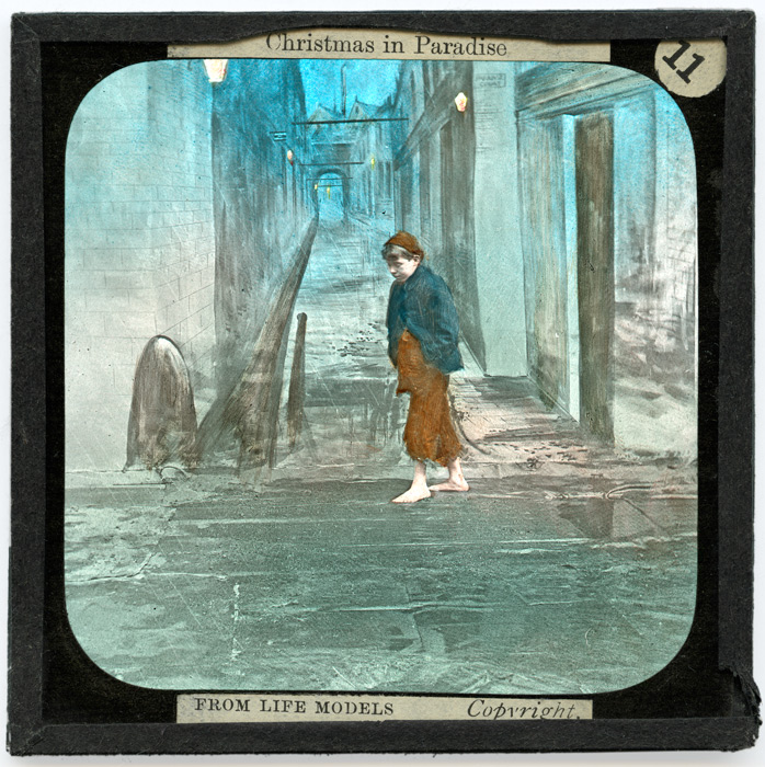 La projection s'ouvre sur le plan de la devanture d'un pub, des hommes et enfants y sont assemblés (plaque 2), puis le spectateur est invité à l'intérieur (plaque 3) et voit la débauche du lieu qui mène ceux qui le fréquentent jusqu'à se battre (plaque 4). Non loin de là, alors que la pluie fait rage, un enfant dont la pauvreté est apparente vend des journaux à la criée (plaque 5). Il rencontre un des ses amis et discute avec lui (plaque 6 et 7) avant de se retrouver à nouveau seul sous la pluie (plaque 8). A l'intérieur du pub, la mère de l'enfant le recherche (plaque 9 et 10). L'enfant seul, décide de rentrer chez lui (plaque 11) où ne l'attend ni feu chaleureux ni repas chaud (plaque 12).