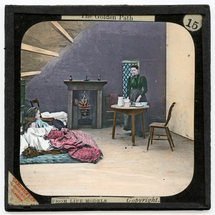 De retour dans son quartier, Nellie montre les vêtements à son frère et lui raconte sa rencontre avec Mme Trevelyan (plaque 11). Ce soir là, les deux enfants décident de prier (plaque 10), ce qui plonge la mère dans une intense réflexion (plaque 13). Elle se souvient avoir prier quand son mari est mort (plaque 14).