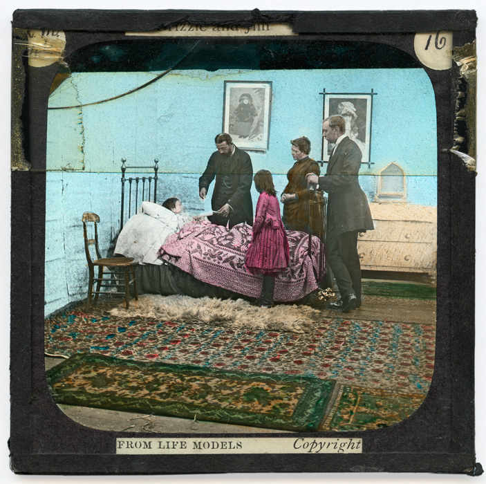 Elle pleure car son petit frère Teddy vient de mourir. Mr Thomson décide de la raccompagner à l'intérieur pour réconforter le reste de la famille (plaque 3). Il découvre alors la pauvreté de la famille et Mme Terriss, mère éplorée qui est en colère contre son mari : à cause de lui et de son penchant pour l'alcool, ils ne peuvent payer des funérailles dignes à leur enfant (plaque 4).